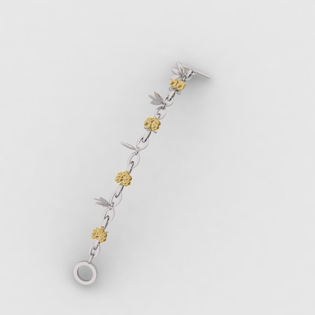 Whimsical and elegant, this sterling silver bracelet features a series of delicate charms, including golden floral accents and dainty wing motifs. Finished with a classic toggle clasp, it’s a charming piece full of personality and shine.