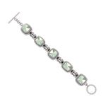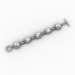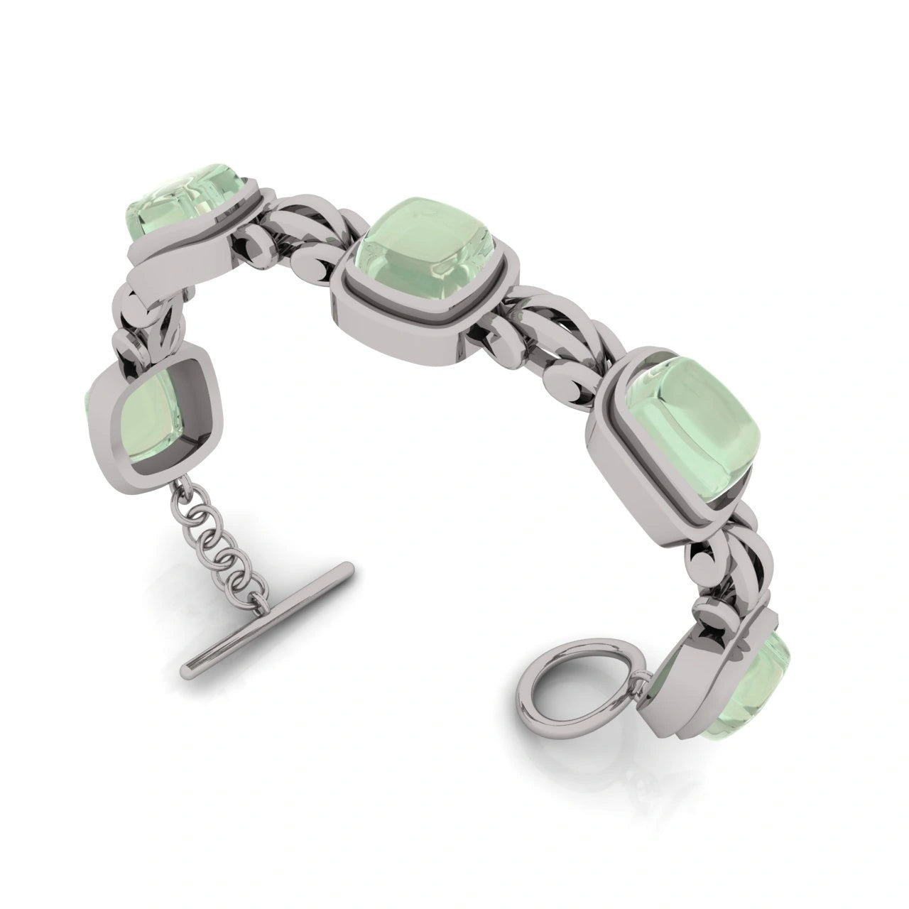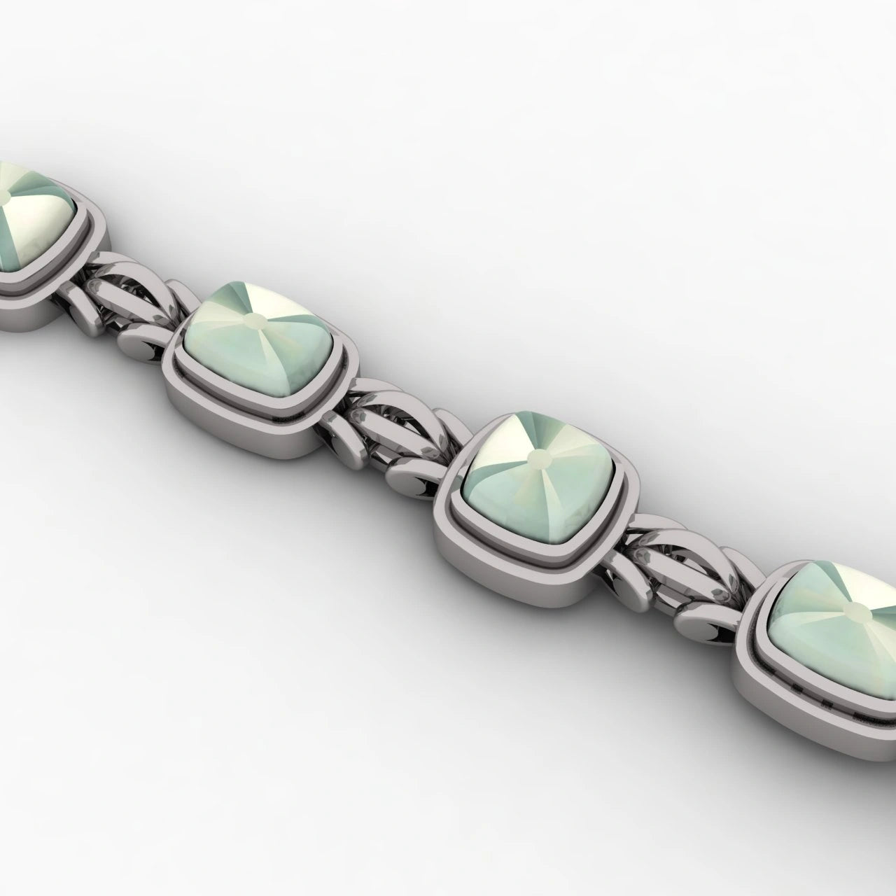 A symphony of elegance and subtle color. Five square-cut light green gemstones shimmer with a soft, faceted glow, each cradled in a sleek silver-toned frame. Interlocking metal connectors lend an artisanal touch, while the toggle clasp adds timeless charm and effortless wearability.