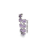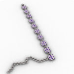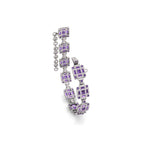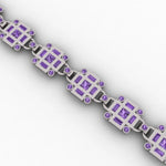 This bracelet showcases a linear arrangement of square-shaped links, each meticulously adorned with vibrant purple gemstones. At every corner, smaller circular stones add depth and sparkle, creating a geometric harmony that’s both bold and refined. The chain link extension and secure clasp offer versatility and comfort, while the rich orchid hues evoke a sense of regal elegance.