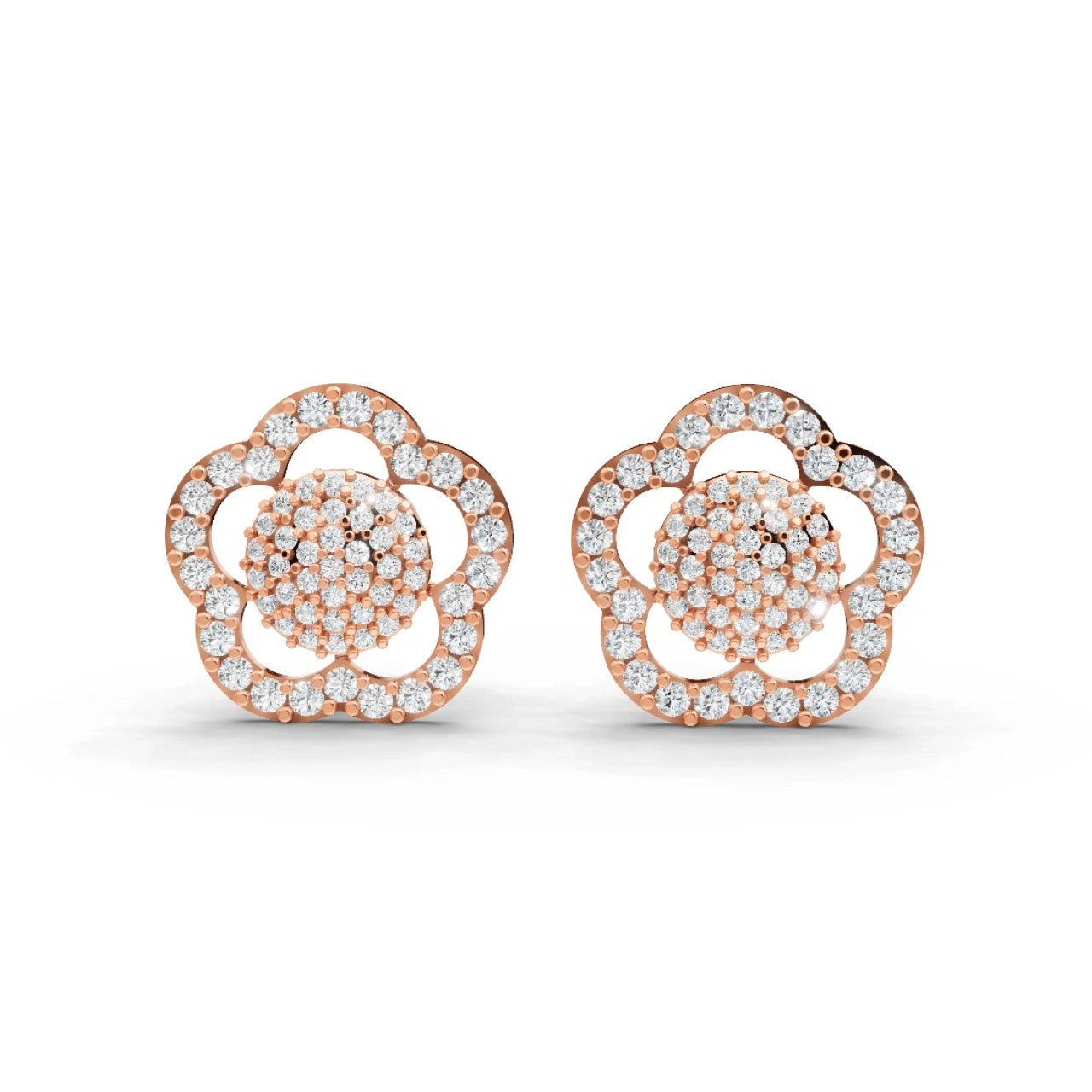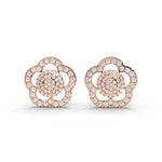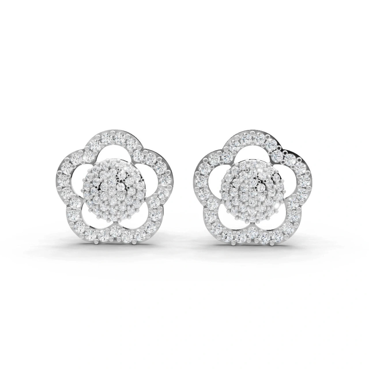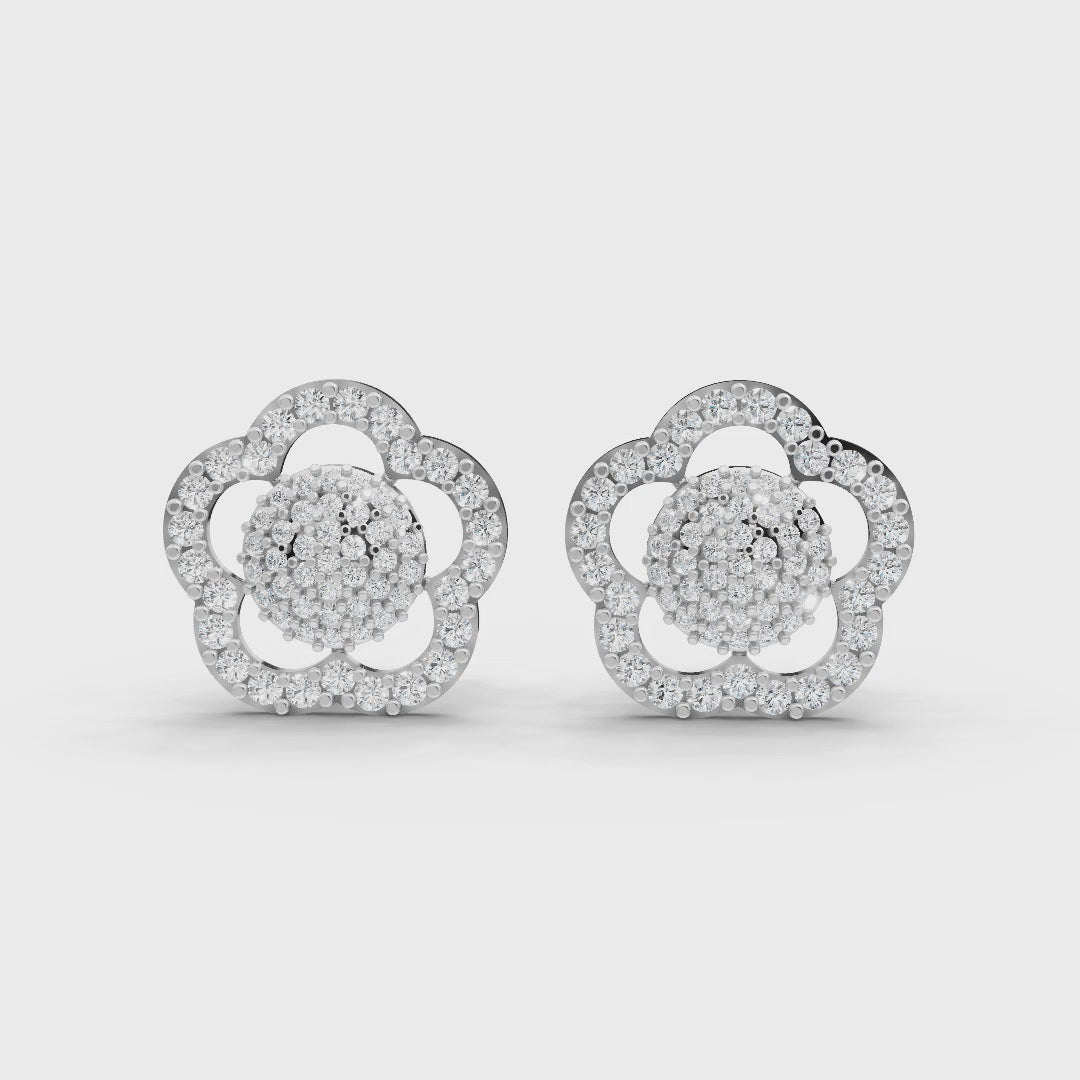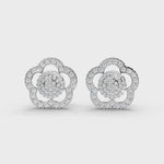 A dazzling pair of flower-shaped earrings, crafted with elegance and intricate detail. Each earring is designed like a blooming flower, giving it a timeless, feminine charm. A central cluster of small diamonds is surrounded by petal-like motifs, all encrusted with more diamonds for added sparkle.