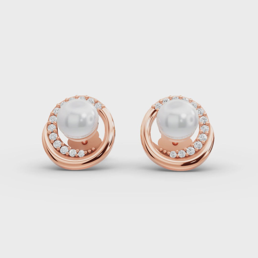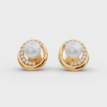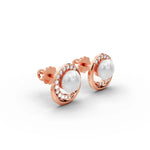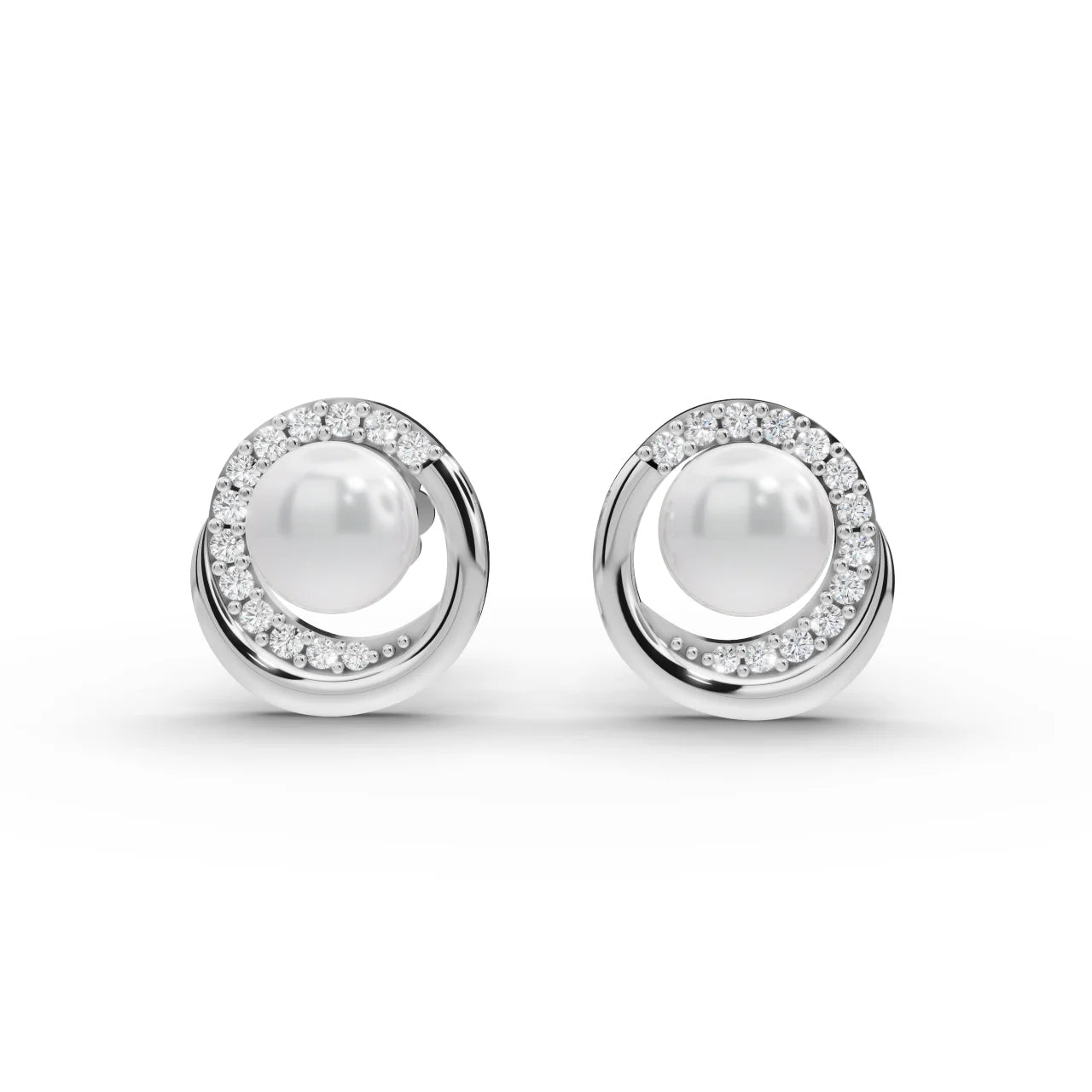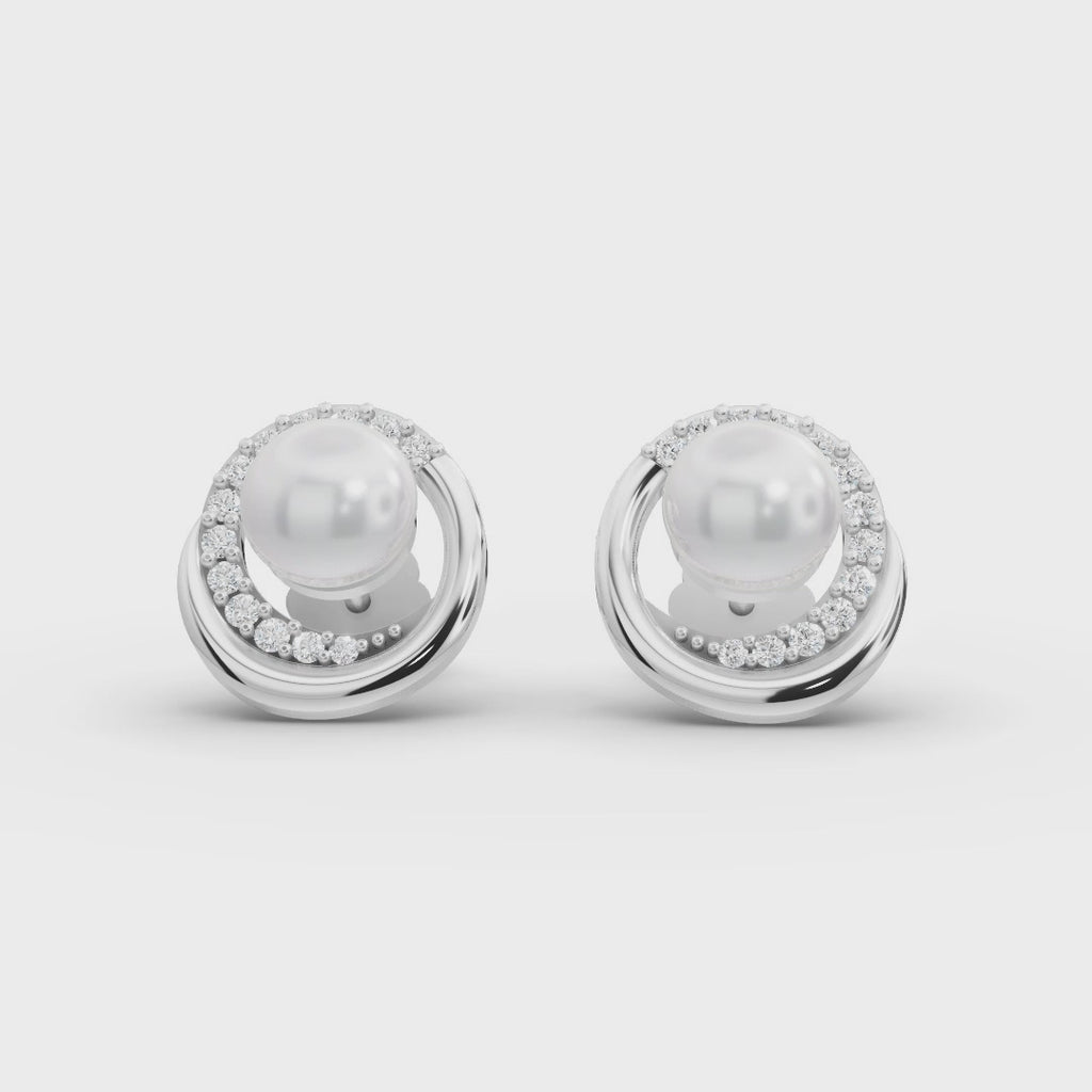 Radiant pearl sits at the center, encircled by a graceful ring of glittering diamonds, all nestled in a cool-toned setting. This timeless pairing of pearl and diamond evokes purity and prestige, making the studs equally fitting for a bridal ensemble or an elevated everyday look. Their butterfly back closures keep the sparkle securely in place, as if each earring is guarding its own little galaxy.