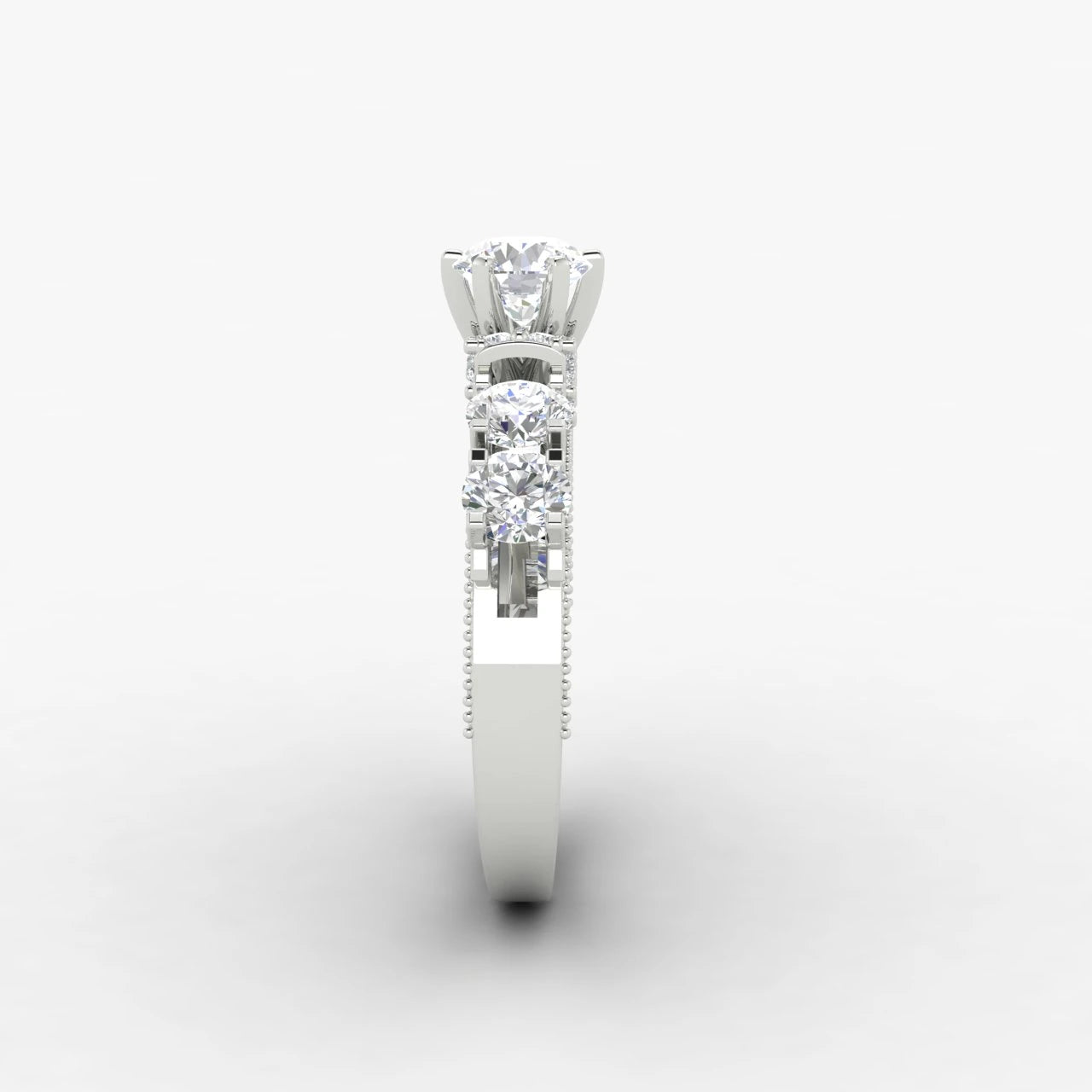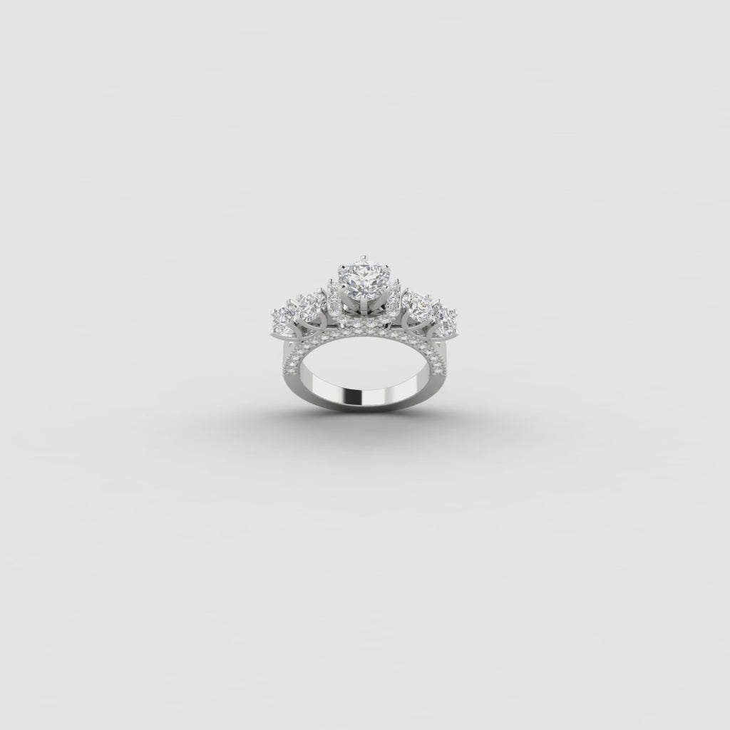 A ring fit for royalty. This breathtaking engagement ring features a 1.07 carat center solitaire, hand-selected for its brilliance and fire, set in gleaming 14K white gold. The design is inspired by the graceful curves of a crown, with intricately placed diamonds adorning not just the shank but also the sides of the ring—ensuring sparkle from every angle.